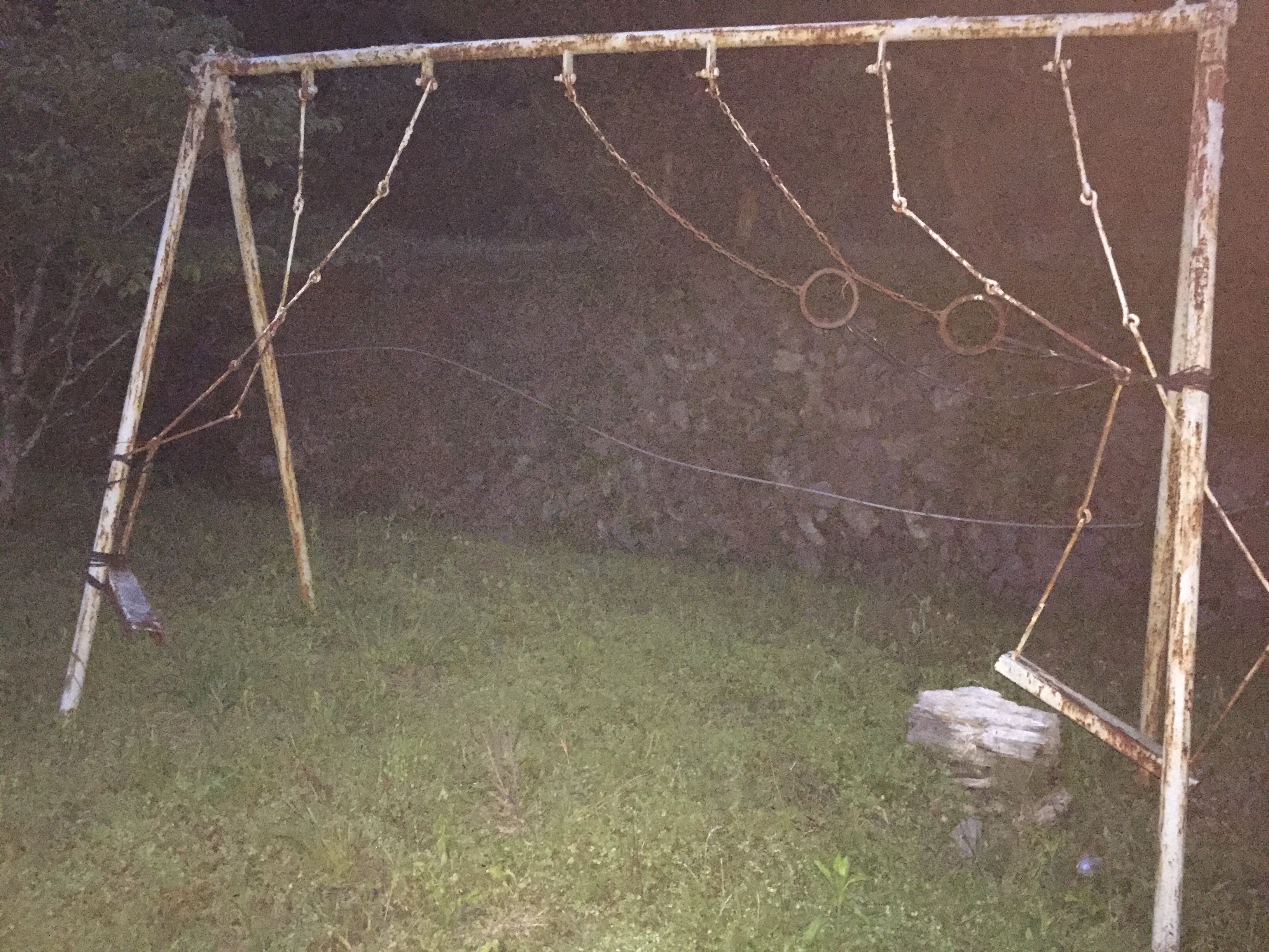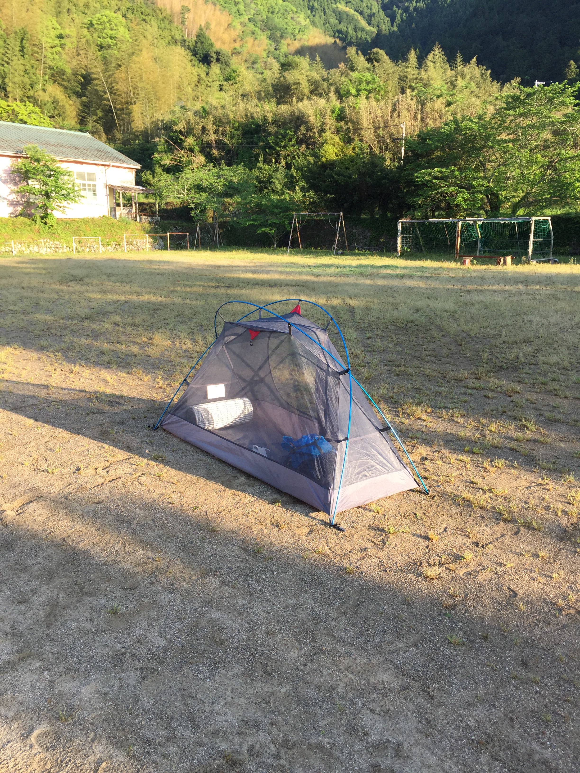 そして猛烈にお腹は減っているけれど、辺りには当然のごとく何もない。本日、パンとお菓子しか食べていないというアイドルばりの食生活に加え、廃墟の小学校に独り、更には、山の方なのでかなり寒い、という悪条件が加わりもはや笑えてきた僕は、何を血迷ったのかこの状況を楽しもうと、屋根の下ではなく、校庭にフライシートを被せずテントを張った。