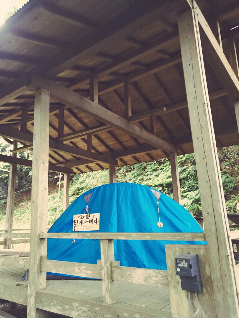 が、仮眠のはずが結局4時間くらい寝てしまった。18時になり雨は上がっていたものの、これから野宿場所を探すのも億劫だったので今日はこのまま境内にテントを張ることにした。